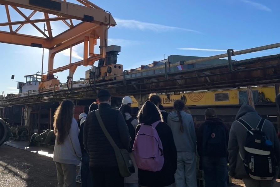 Auf der Hitzler Werft erfuhren die Lernenden, wie Schiffe gebaut und repariert werden. Besonders interessant war das neue Fährschiff, das bald Menschen und Autos zwischen Lauenburg und Hohnstorf über die Elbe transportieren soll. Außerdem steht momentan bei uns in Lauenburg ein Schiff aus Hamburg von dem „König der Löwen“-Theater zur Reparatur.